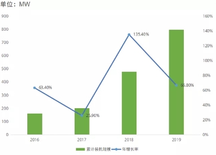 圖2:2016-2019年中國已投運光伏儲項目的累計裝機規(guī)模