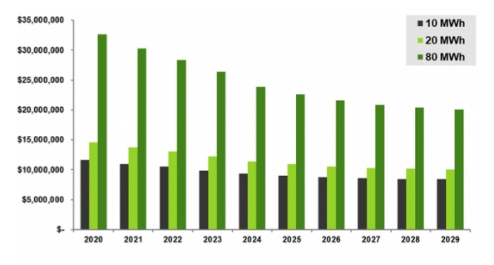 Alex Eller說(shuō),在儲(chǔ)能系統(tǒng)層面上,而不是在電池或電池組層面上,重要的是要考慮持續(xù)放電時(shí)間對(duì)儲(chǔ)能項(xiàng)目成本的影響。鋰離子電池儲(chǔ)能系統(tǒng)的持續(xù)放電時(shí)間越長(zhǎng),儲(chǔ)能容量越大,成本也越高。