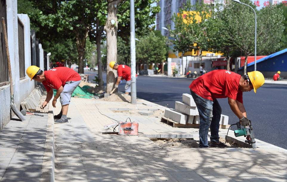6月12日,施工人員對人行步道進(jìn)行修繕(新華社記者 任超 攝)