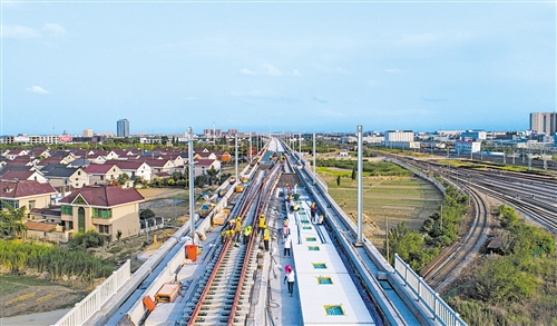 6月11日,鹽通高鐵施工人員在江蘇海安段進(jìn)行無砟軌道施工。