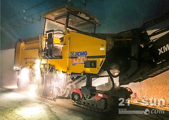 該隧道為雙向兩車道,施工工藝為局部路面挖補。從水泥路面中間處3cm的銑刨深度到路面兩側最深一次下刀9cm銑刨深度,XM200KⅡ高性能鋼板焊接的銑刨室、左右邊板、后刮板等高結構強度,確保了銑刨工作的穩(wěn)定,速度可達3.6m/min。