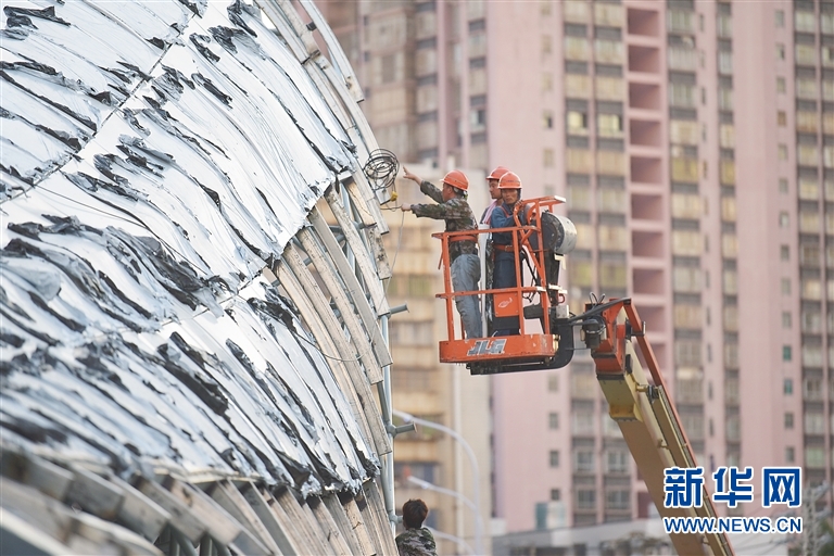 6月13日,3名工人乘坐“云梯”在??谖拿鳀|越江通道項(xiàng)目出入口施工。