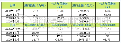 據(jù)海關(guān)數(shù)據(jù)顯示,2020年5月份我國(guó)光伏玻璃出口數(shù)量為14.77萬(wàn)噸,同比22.59%,出口金額為1.36億美元,同比減少8.76%。5月,光伏玻璃進(jìn)口數(shù)量為0.06萬(wàn)噸,同比下滑60%,進(jìn)口金額為502.7萬(wàn)美元,同比減少17.73%,光伏玻璃進(jìn)出口數(shù)據(jù)雙方向持續(xù)低迷。