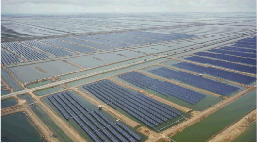 總投資15.24億元、占地7800余畝的濱州市沾化區(qū)濱海鎮(zhèn)通匯“漁光一體”現(xiàn)代產(chǎn)業(yè)園,采用漁光一體模式進(jìn)行綜合開發(fā),將光伏電站與養(yǎng)殖業(yè)相結(jié)合,在蝦池上建設(shè)光伏電站,形成“上可發(fā)電,下可養(yǎng)殖”的發(fā)電模式,將現(xiàn)代智慧農(nóng)業(yè)、光伏產(chǎn)業(yè)進(jìn)行科學(xué)、有機(jī)的結(jié)合,并適度疊加休閑觀光農(nóng)業(yè),打造集新漁業(yè)、新能源、新農(nóng)村為一體的“三新”現(xiàn)代產(chǎn)業(yè)園,把不毛之地變成寸金寸土的寶地,實(shí)現(xiàn)了向鹽堿地要效益。該產(chǎn)業(yè)園是目前全國最大的單體“漁光一體”項(xiàng)目。 來源: 大眾日報(bào)