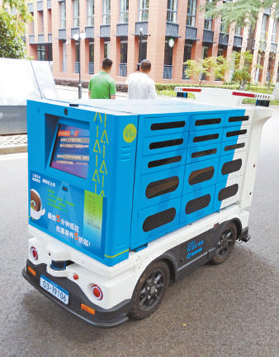 上海交大校園里的菜鳥(niǎo)驛站無(wú)人駕駛快遞車(chē)。 人民視覺(jué)