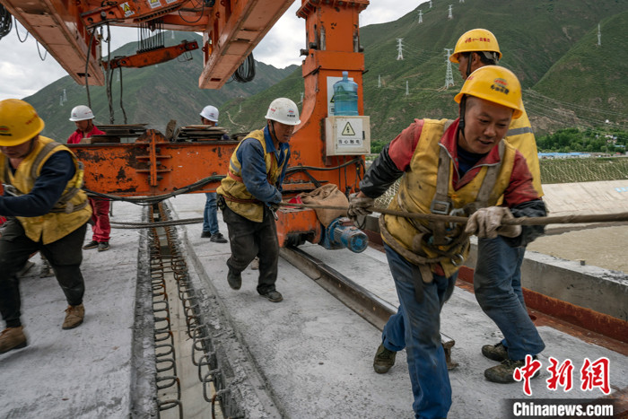 圖為當(dāng)日,架橋機(jī)在雅魯藏布江上方進(jìn)行架設(shè)作業(yè)。中新社發(fā) 崔金鳳 攝