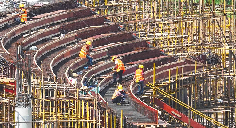 7月8日,在儋州市體育中心“一場兩館”項目建設現(xiàn)場,體育場和體育館正在進行主體結(jié)構施工建設,游泳館仍處于基礎施工階段,工程車輛來往穿梭,工人正忙著施工。