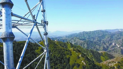“最高一跨”像一座銀色的鋼鐵長城,矗立在河北省保定市淶源縣烏龍溝長城風(fēng)景宜人的山頂上,雄偉壯麗,熠熠生輝。