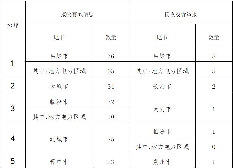 各地市按照收到的有效信息數(shù)量排序,呂梁市、太原市、臨汾市、運(yùn)城市、晉中市等列轄區(qū)內(nèi)前5位;按照投訴舉報數(shù)量排序,呂梁市、長治市、大同市、臨汾市、朔州市等排在轄區(qū)內(nèi)前5位。(2020年6月有效信息及投訴舉報排名前5位情況見表三)