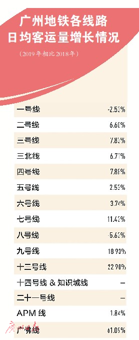 二號線、三號線(含北延段)是廣州地鐵客流量最大的兩條線路,而且呈持續(xù)上升趨勢。2019年廣州地鐵年報顯示,二號線去年日均客流量為143.49萬人次,同比增長6.60%;三號線131.80萬人次,同比增長7.83%;三號線北延段87.14萬人次,同比增長6.71%。