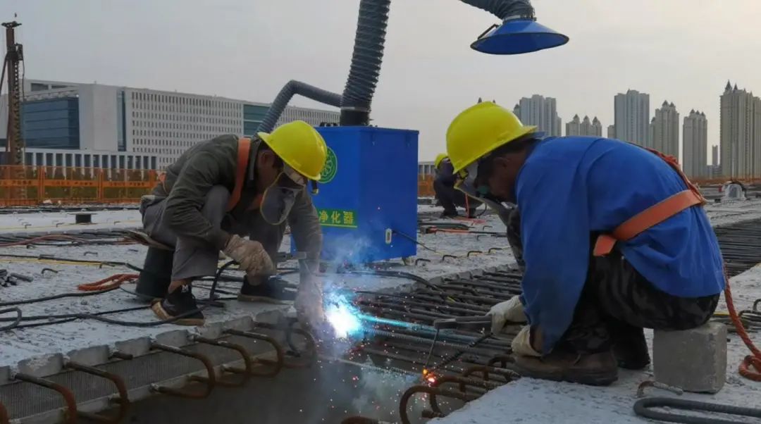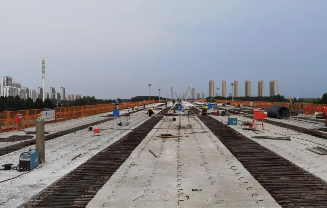 在已架設完成的箱梁上,記者看到,工人們?nèi)齼梢唤M,正在對裸露的鋼筋進行焊接,不時火花四濺。“現(xiàn)在進行的是濕接縫的施工。”項目四標段總工程師楊晴告訴記者,一道濕接縫有30米長,共有1100個焊接縫,等焊接完成后,就可以進入支模板和澆筑的工序了。