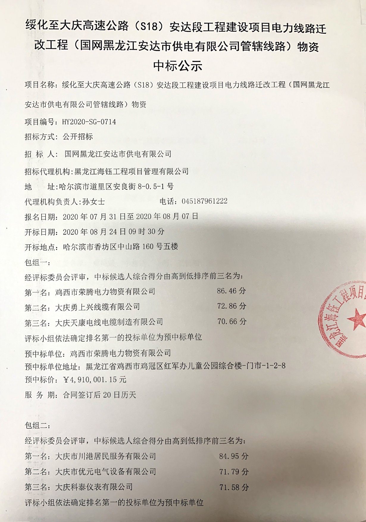 移動版:【綏化至大慶高速公路(S18)安達段工程建設(shè)項目電力線路遷改工程(國網(wǎng)黑龍江安達市供電有限公司管轄線路)物資】中標結(jié)果公告
