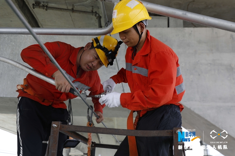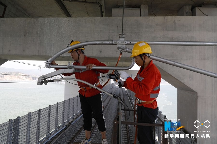 十幾名接觸網(wǎng)工在檢查大橋上的接觸網(wǎng)供電設(shè)備。新華網(wǎng)發(fā)(胡鵬 攝)