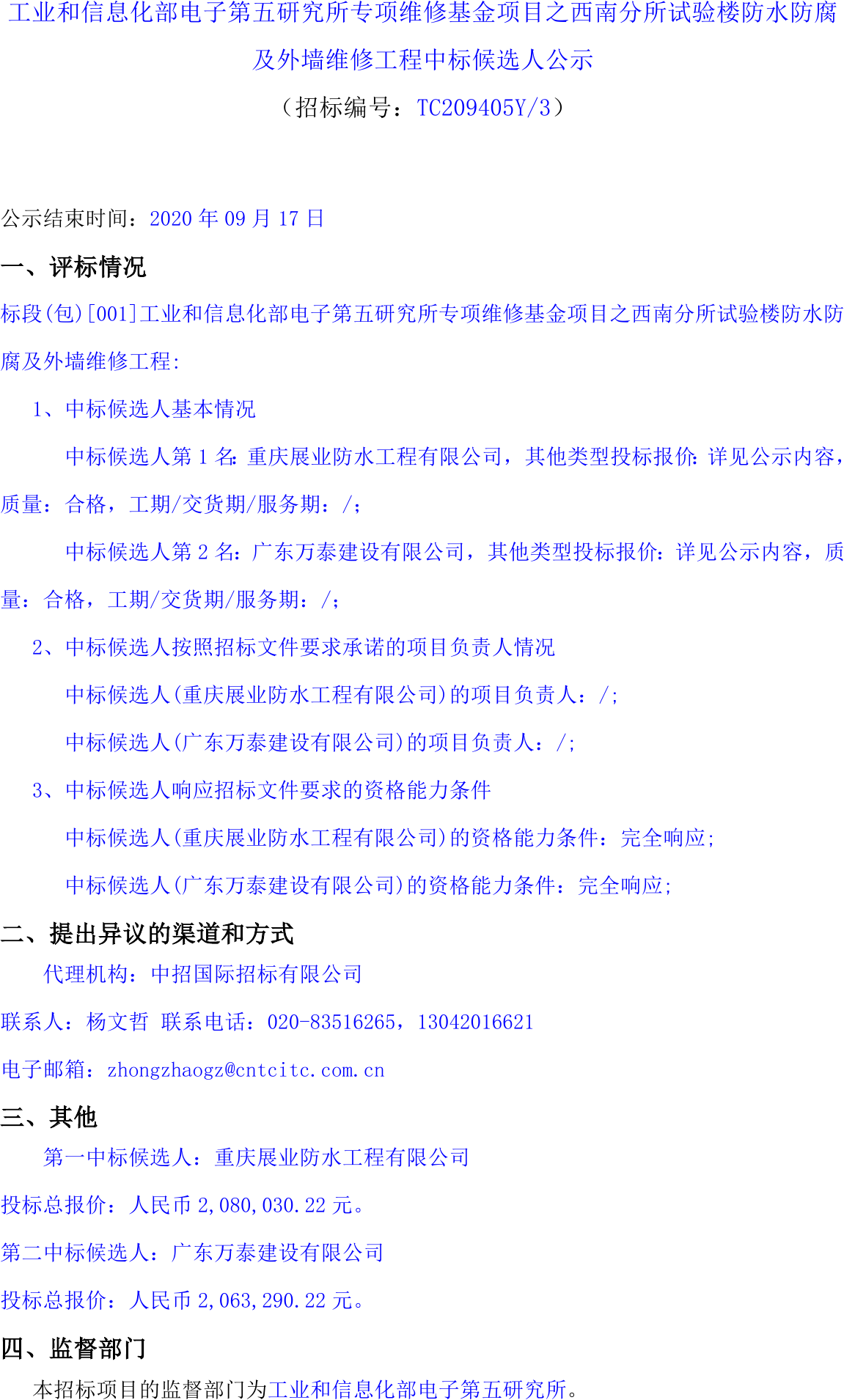 工業(yè)和信息化部電子第五研究所專項(xiàng)維修基金項(xiàng)目之西南分所試驗(yàn)樓防水防腐及外墻維修工程中標(biāo)候選人公示