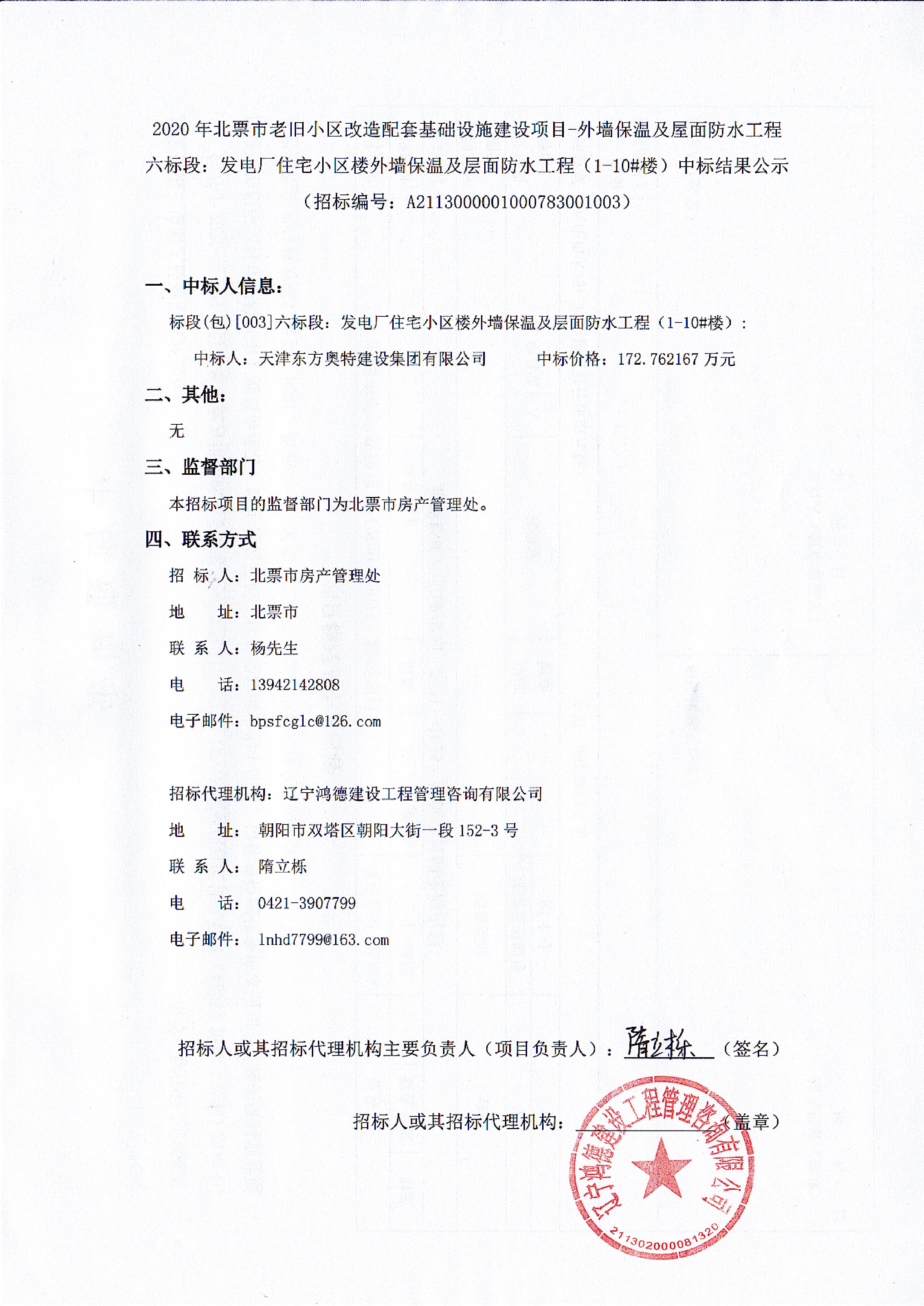 2020年北票市老舊小區(qū)改造配套基礎(chǔ)設(shè)施建設(shè)項(xiàng)目-外墻保溫及屋面防水工程六標(biāo)段:發(fā)電廠住宅小區(qū)樓外墻保溫及層面防水工程(1-10#樓)中標(biāo)結(jié)果公示