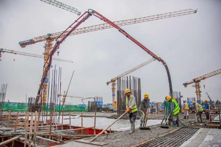 工人正在平面上澆筑水泥
