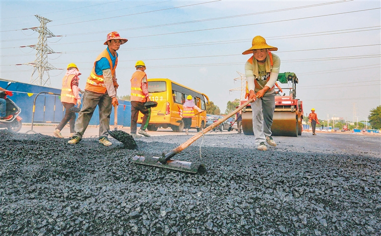 日前,在洋浦經(jīng)濟(jì)開發(fā)區(qū)疏港大道二期工程項目現(xiàn)場,施工人員加緊施工。該工程部分路段已經(jīng)進(jìn)入瀝青鋪設(shè)階段。