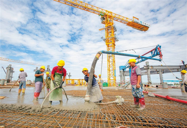 9月21日,在海口國(guó)際免稅城項(xiàng)目工地,建設(shè)者們加緊施工。目前,該項(xiàng)目的免稅商業(yè)中心地下結(jié)構(gòu)即將完工。