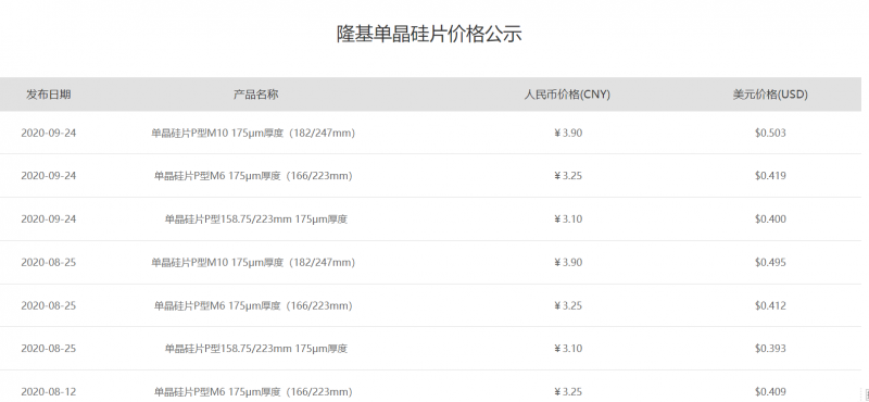 移動(dòng)版:隆基公布最新單晶硅片價(jià)格,與上月持平