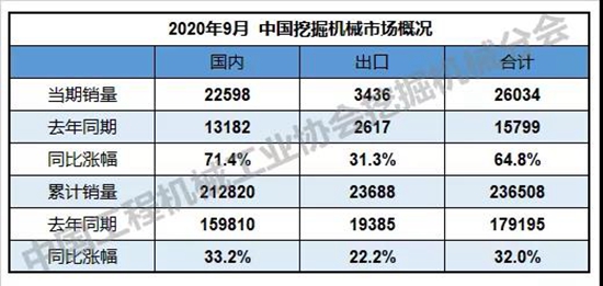 2020年9月,共計銷售各類挖掘機械產(chǎn)品26034臺,同比漲幅64.8%。國內(nèi)市場銷量22598臺,同比漲幅71.4%。出口銷量3436臺,同比漲幅31.3%。