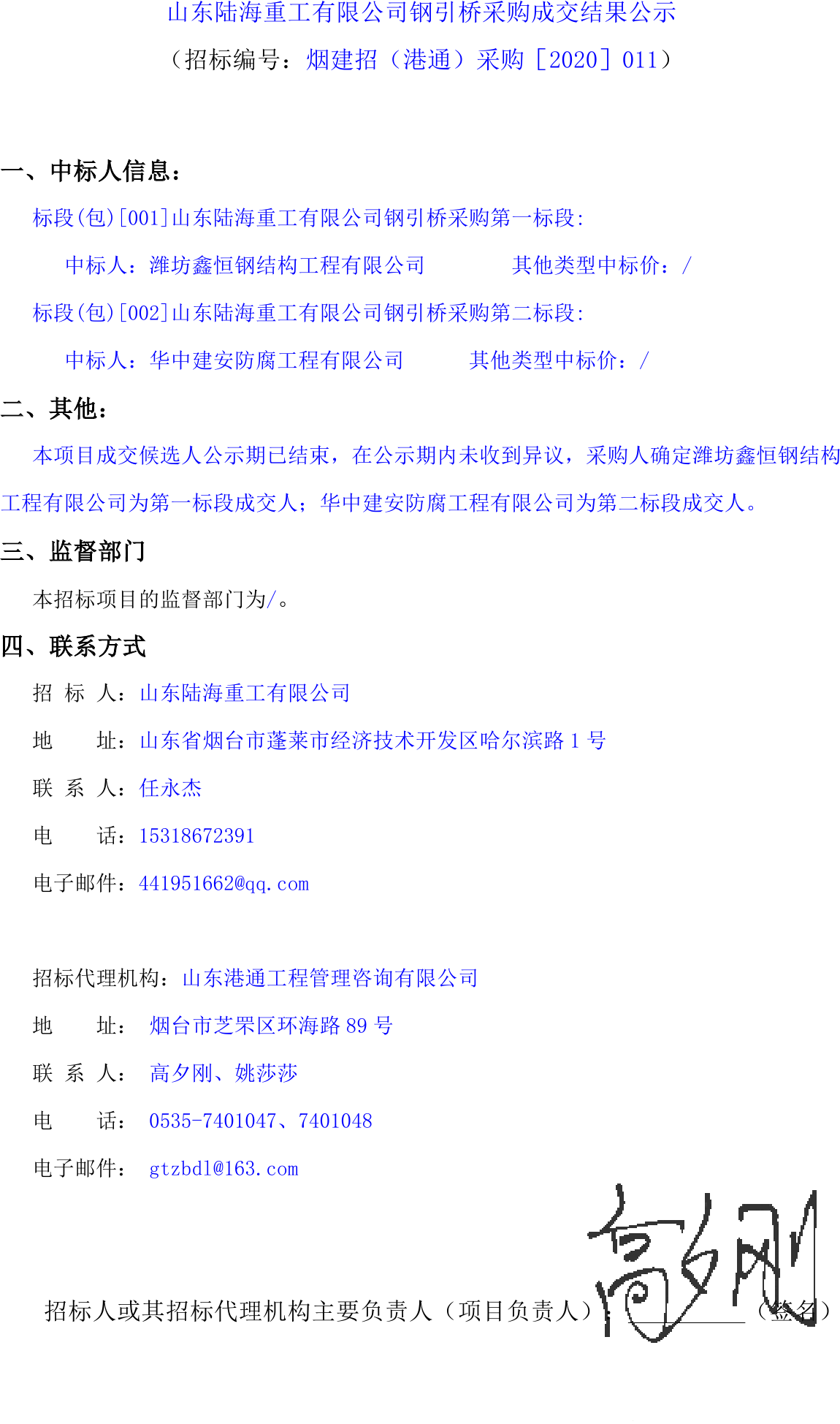 山東陸海重工有限公司鋼引橋采購成交結果公示