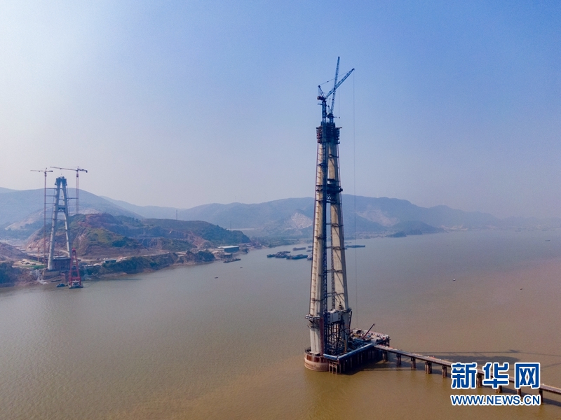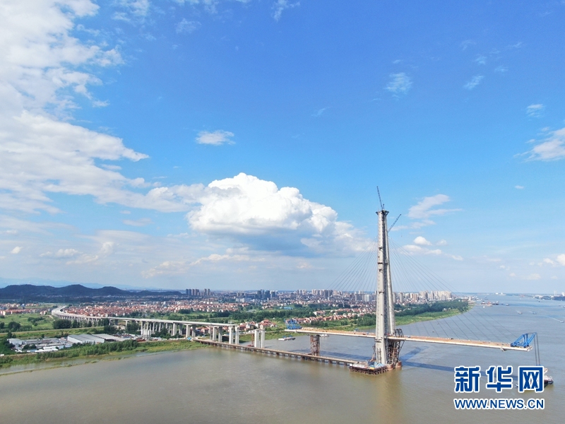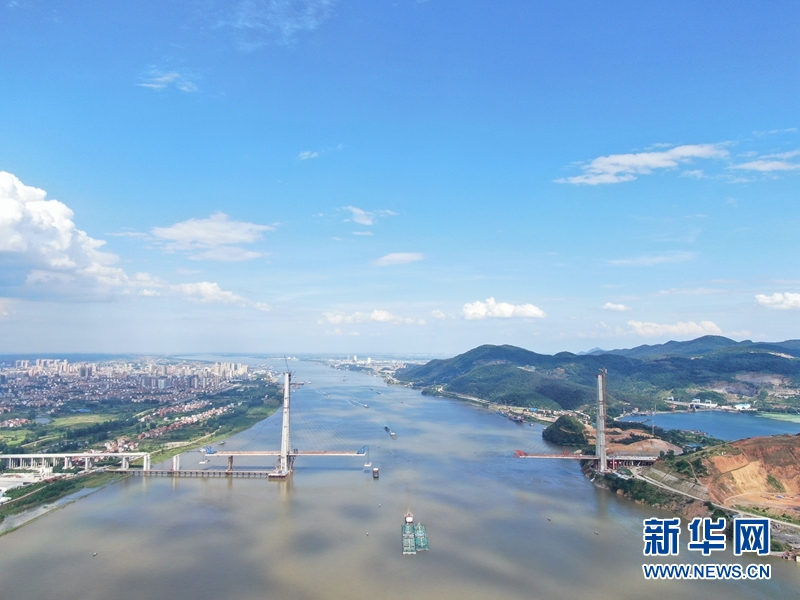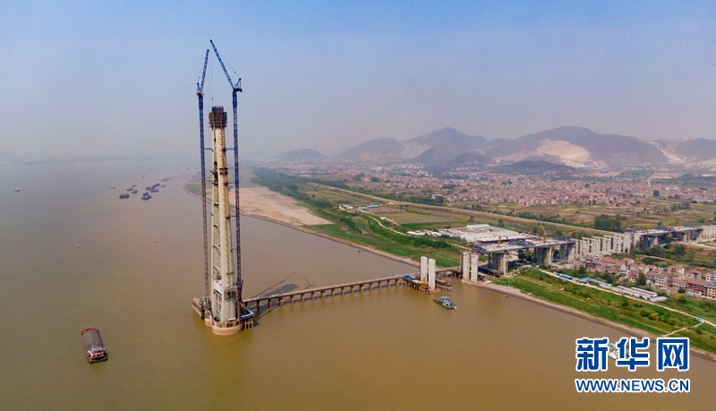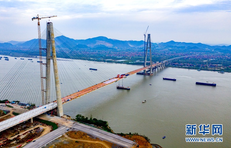 圖為武穴長(zhǎng)江公路大橋建設(shè)中