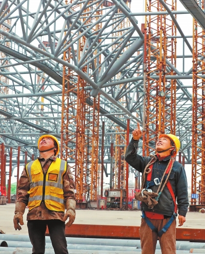 鄭州南站站房工程進行吊裝提升施工現(xiàn)場。記者 聶冬晗 攝