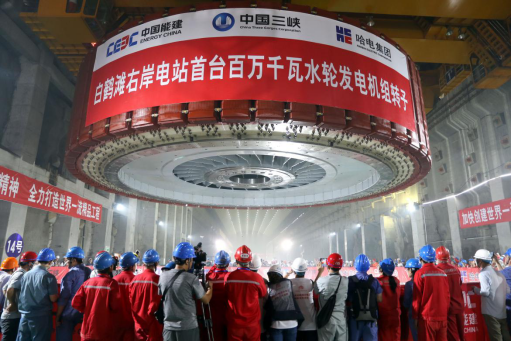 圖為 哈電集團(tuán)研制的首臺白鶴灘百萬千瓦機(jī)組轉(zhuǎn)子吊裝成功