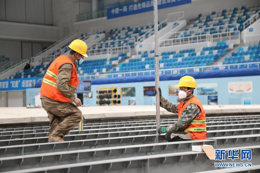 11月27日,工人在國家游泳中心“水立方”比賽大廳進行場地轉(zhuǎn)換結(jié)構(gòu)搭建。