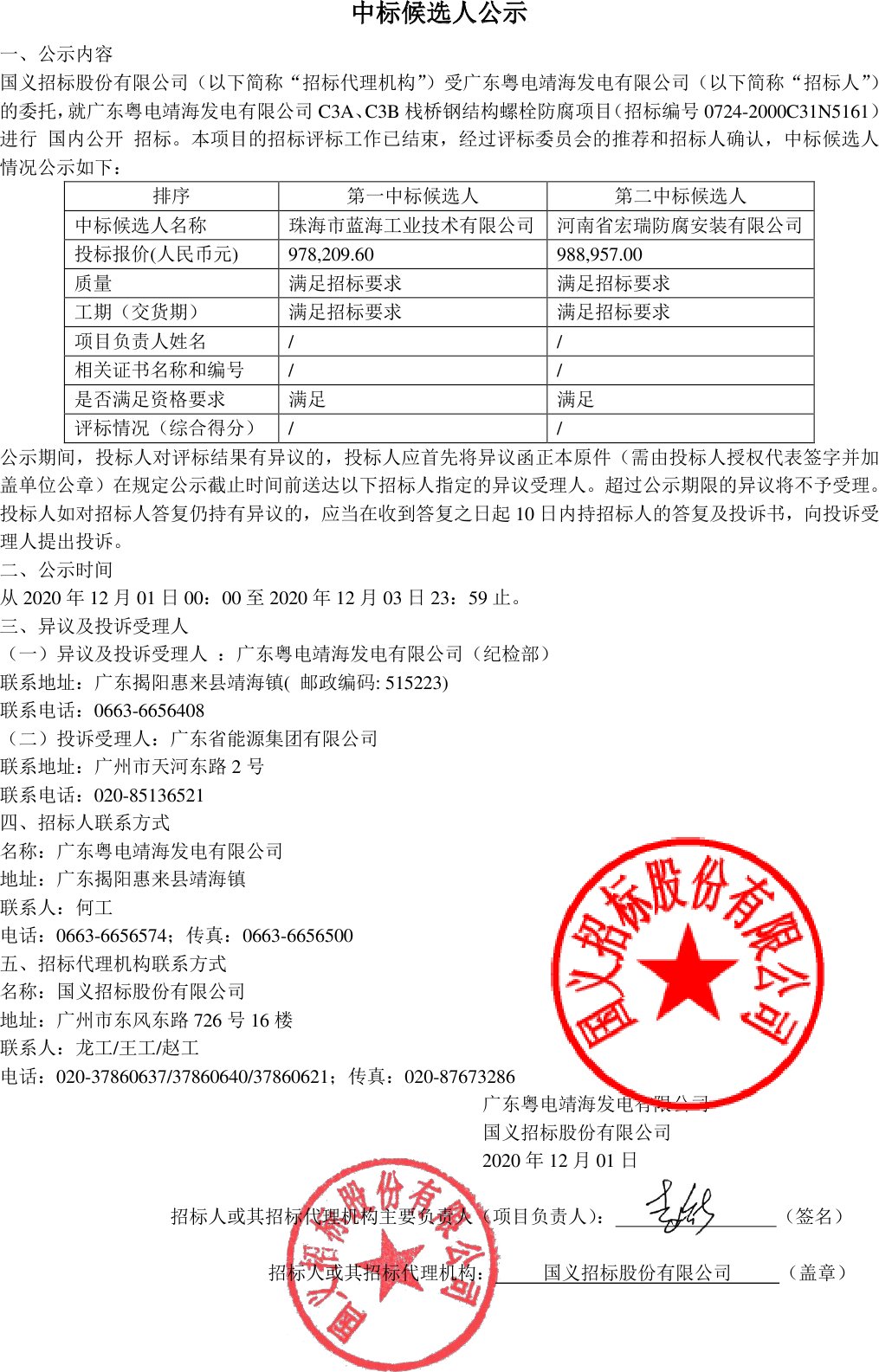 廣東粵電靖海發(fā)電有限公司C3A、C3B棧橋鋼結(jié)構(gòu)螺栓防腐項(xiàng)目中標(biāo)候選人公示
