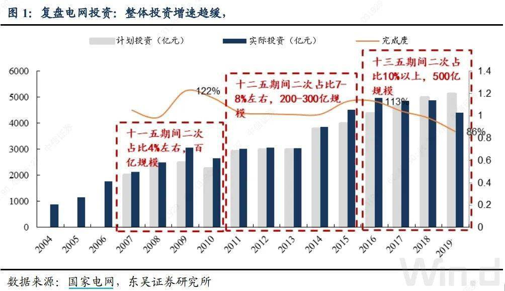 ① 02 年電改-08 年:集中力量解決供電瓶頸:02 年《電力體制改革方案》,國(guó)網(wǎng)開始獨(dú)立運(yùn)營(yíng),彼時(shí)國(guó)內(nèi)電網(wǎng)基礎(chǔ)設(shè)施落后,03-08 年電網(wǎng)投資持續(xù)高增,從 03 年的 1014 億增長(zhǎng)至 08 年的 2885 億,CAGR=23%,投資重點(diǎn)聚焦輸變電基礎(chǔ)設(shè)施環(huán)節(jié);
