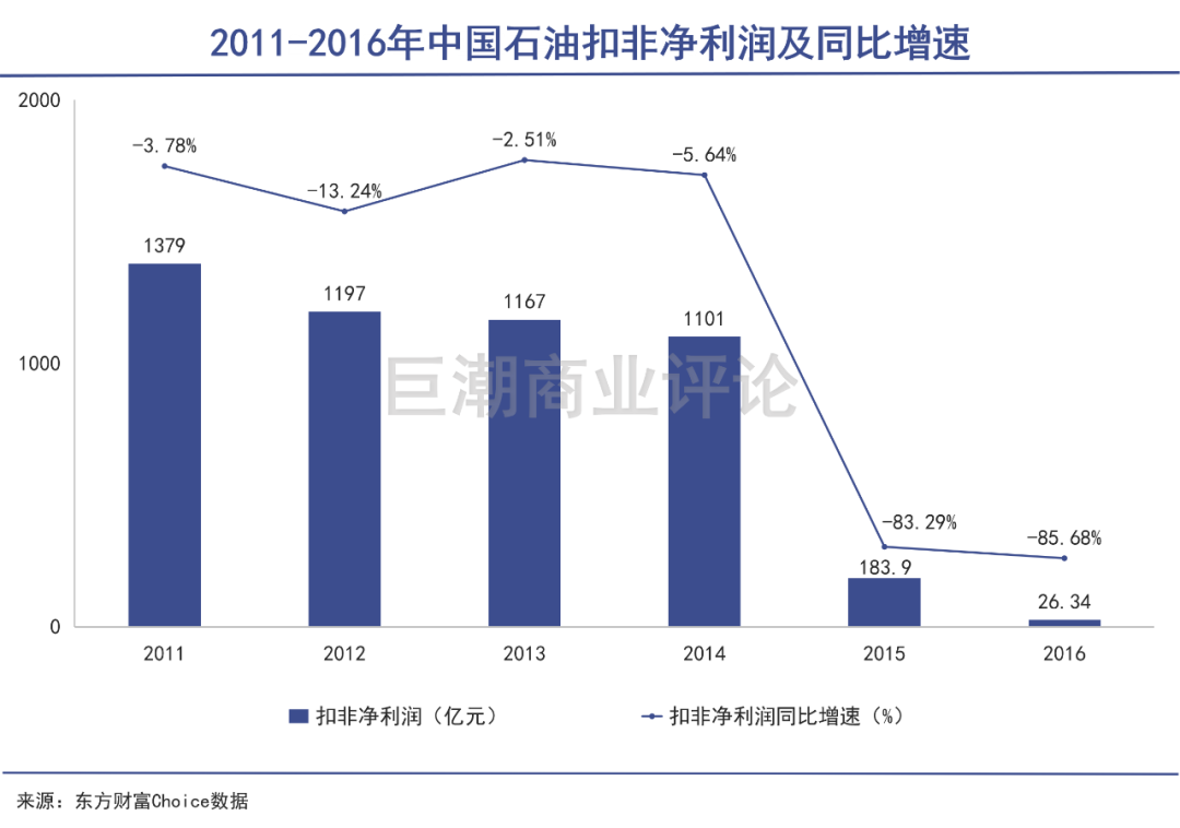 東方財(cái)富Choice提供的財(cái)務(wù)數(shù)據(jù)顯示,2011年到2016年之間,中國(guó)石油的扣非凈利潤(rùn)同比增速為由-3.78%下降至-85.68%,扣非凈利數(shù)額從1379億元直線下滑,一度只剩26.34億元。