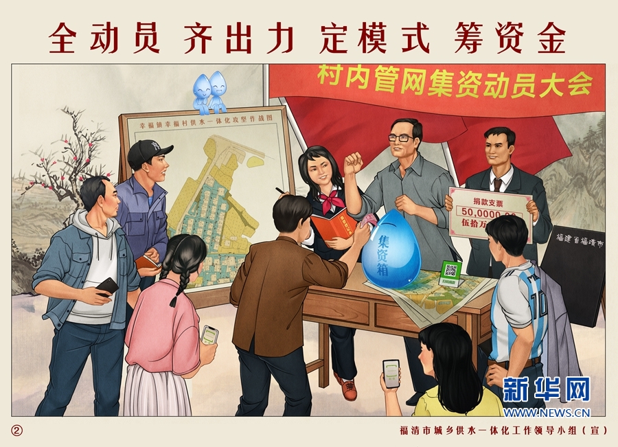 不僅是通過直觀生動的插畫,在推進城鄉(xiāng)供水一體化建設過程中,福清還大量制作橫幅、傳單、宣傳手冊等,在微博、微信、短信、廣播等線上和線下渠道,用村民聽得懂的直白話、看得懂的圖形標、算得清的戶均賬進行廣泛宣傳,做到全民知曉、全民參與。