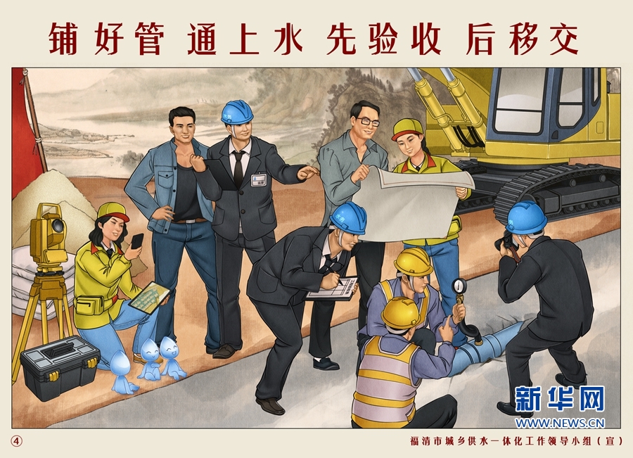 “戶戶通有計劃做設計出圖紙”“全動員齊出力定模式籌資金”“找隊伍買材料細施工強監(jiān)督”“鋪好管通上水先驗收后移交”“優(yōu)質水供城鄉(xiāng)新福清更小康”,這5句話配上5幅色彩明亮、生動活潑的畫面,組成了福清推進城鄉(xiāng)供水一體化的政策宣解插畫。