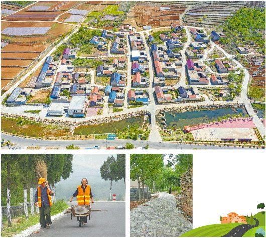 上圖:沂南縣雙堠鎮(zhèn)通村道路進行了硬化。左下圖:蒙陰縣坦常路上,村民正在管護公路。右下圖:崮崖村利用石板修路,突出古村落的古樸風格。