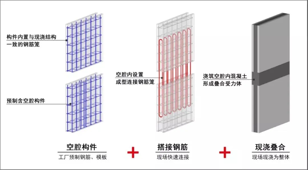 據(jù)了解,SPCS 3.0結(jié)構(gòu)技術(shù)體系以“空腔+搭接+現(xiàn)澆”為核心,通過工廠預(yù)制含鋼筋籠的空腔構(gòu)件,代替了現(xiàn)場綁鋼筋、支模板的工作,大量減少了現(xiàn)場施工量,對(duì)過去復(fù)雜的施工工序進(jìn)行簡約。其次,空腔內(nèi)安放成型連接鋼筋籠,通過搭接即可實(shí)現(xiàn)預(yù)制構(gòu)件間的連接,較傳統(tǒng)構(gòu)件而言,操作便利且效率更高。此外,空腔內(nèi)澆注混凝土,形成疊合受力體,確保整體安全。