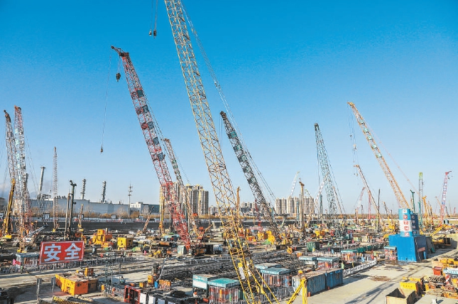 城市副中心站綜合交通樞紐施工現(xiàn)場塔吊林立、機器轟鳴,一派熱火朝天的建設景象。