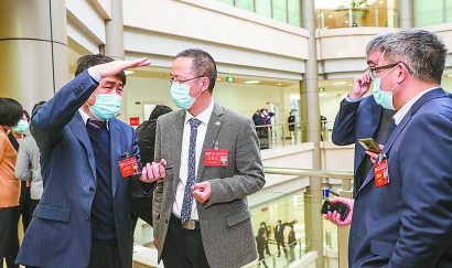 昨天,王如路委員(左一)在分組會(huì)議間隙,向多位委員介紹,隨著15號(hào)線的投入運(yùn)營,上海軌道交通總運(yùn)營公里數(shù)達(dá)到772公里,成為世界上運(yùn)營里程最長(zhǎng)的軌道交通城市。記者 張海峰 攝