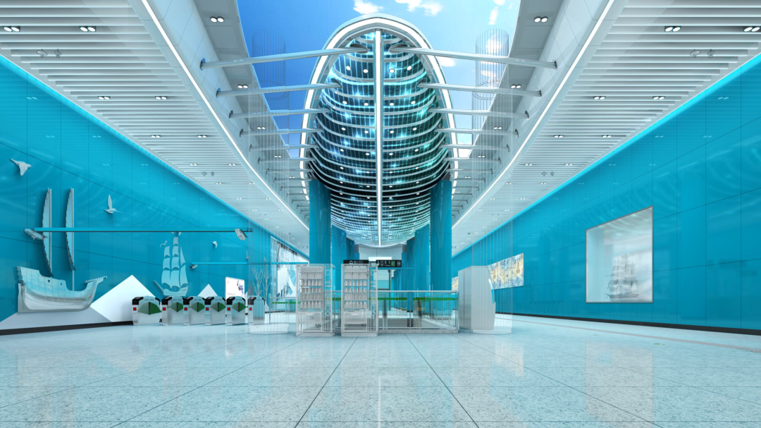 六緯路站以漕運商業(yè)歷史變遷為創(chuàng)作題材,站廳層高大空間吊頂主要為雙曲面船造型,站臺層吊頂以船頭造型為主,墻面LED屏講述漕運文化帶動天津商貿(mào)發(fā)展的故事,展現(xiàn)天津漕運歷史文化。