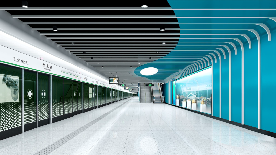 泰昌路站通過采用投影全景式天花、方通組合墻面等造型,展現(xiàn)天津獨具魅力的國際商貿(mào)中心和國際性時尚消費之都特色。