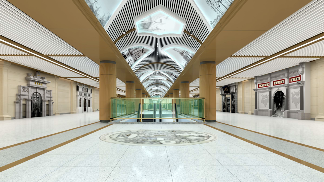 徐州道站主打木紋鋁板造型門,墻面金屬花格、墻面造型柜、仿古文化磚,墻面櫥窗展示以天津老字號商業(yè)發(fā)展史為藝術(shù)創(chuàng)作題材對空間進行塑造,展現(xiàn)天津商業(yè)的繁榮景象和百年歷程。