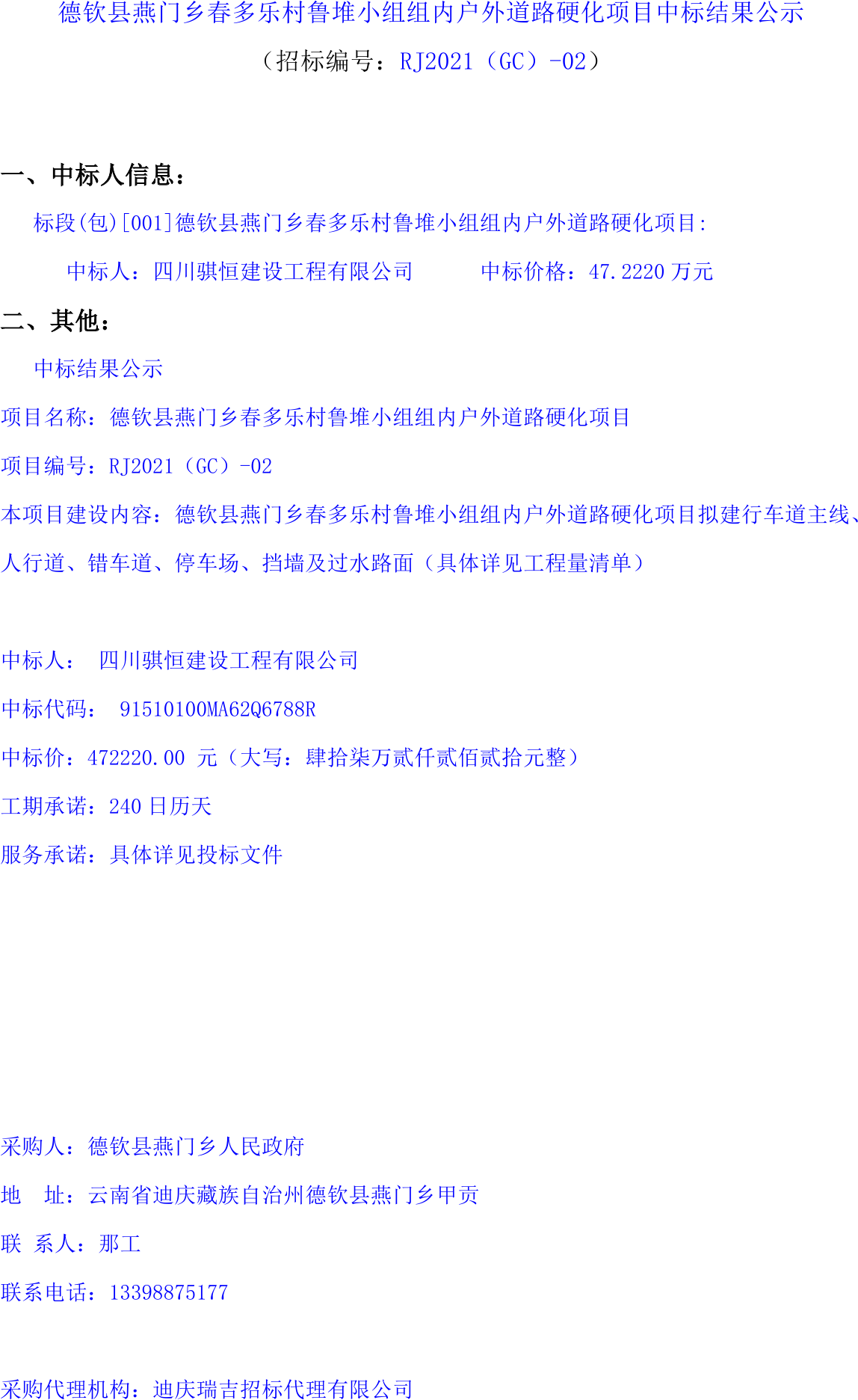 移動(dòng)版:云南:德欽縣燕門(mén)鄉(xiāng)春多樂(lè)村魯堆小組組內(nèi)戶(hù)外道路硬化項(xiàng)目中標(biāo)結(jié)果公示