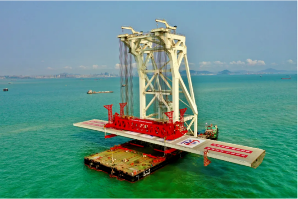 “天一號”是國內(nèi)首創(chuàng)單體船型結(jié)構(gòu)、全電力推進的海上架梁施工專用起重船,最大起吊重量為3600噸,無需輔助船舶,既可獨立完成取梁、運梁和架梁工作。相比普通的浮吊架設(shè),運用該船可有效減少工序交接時間,提高架設(shè)效率和安全。