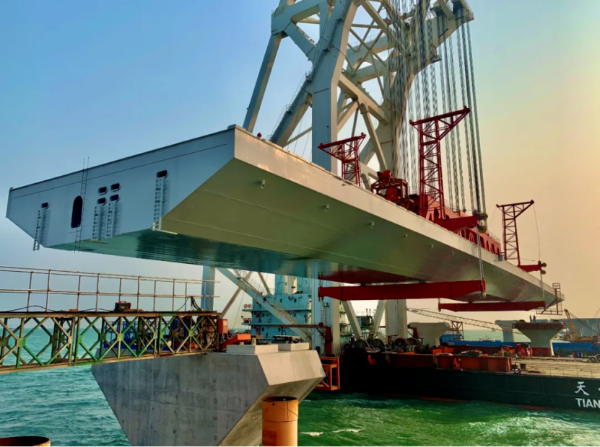 4月2日下午,國內(nèi)首創(chuàng)運架一體船“天一號”將深中通道首片長133.1米、寬20米、高4米、重達1780噸的鋼箱梁,平穩(wěn)運至指定橋位。隨著指揮一聲令下,現(xiàn)場作業(yè)人員全程緊盯、精細協(xié)作,將首片鋼箱梁穩(wěn)穩(wěn)地架設(shè)到伶仃東泄洪區(qū)非通航孔橋右幅5號至6號橋墩之間。經(jīng)監(jiān)控測量,鋼箱梁架設(shè)精度及線形滿足規(guī)范及設(shè)計要求。