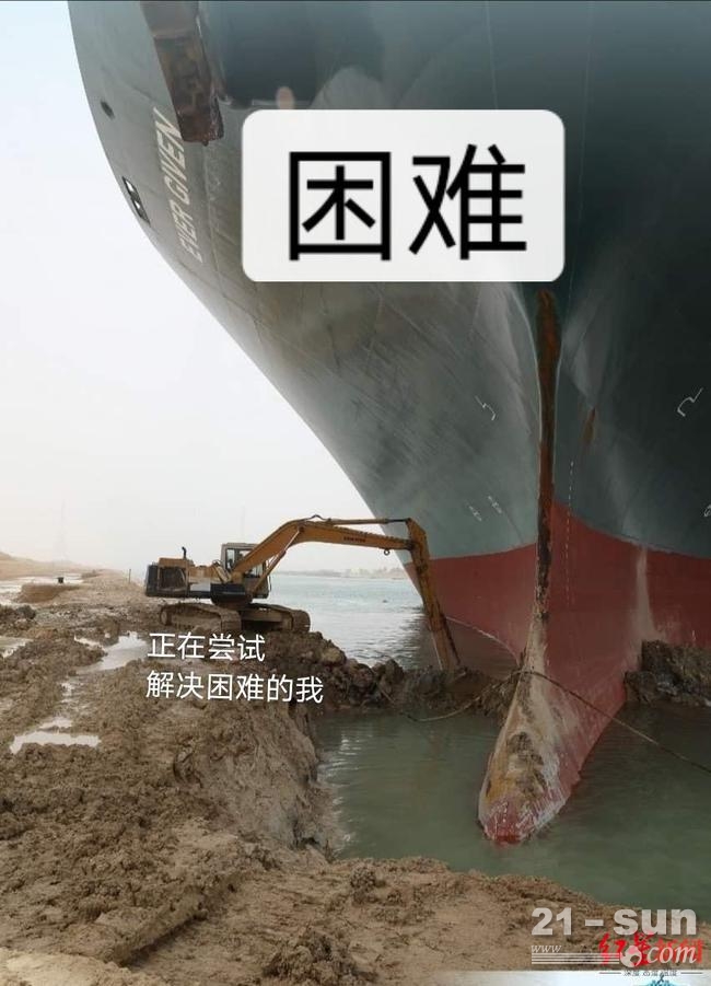 為了解救擱淺的“長(zhǎng)賜號(hào)”,蘇伊士運(yùn)河管理局派出一輛挖掘機(jī)(后又派出多輛挖掘機(jī)),疏通船身周圍的沙石。