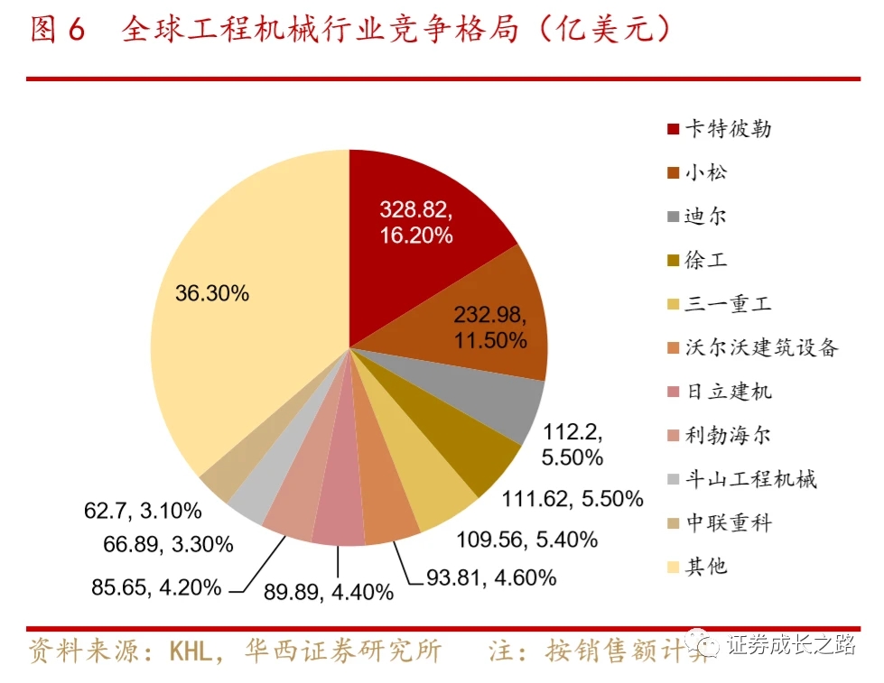 根據(jù)KHL數(shù)據(jù)顯示,2007-2019年全球工程機(jī)械銷售額在1500-2000億美元之間波動(dòng)。2019年全球工程機(jī)械銷售達(dá)2027.24億美元,同比增長(zhǎng)9.88%,創(chuàng)歷史新高。就國(guó)內(nèi)來(lái)看,2019年我國(guó)工程機(jī)械銷售額達(dá)到6560億元,亦創(chuàng)新高。我國(guó)一直以來(lái)是工程機(jī)械需求大國(guó),占全球銷售額的比重約50%。