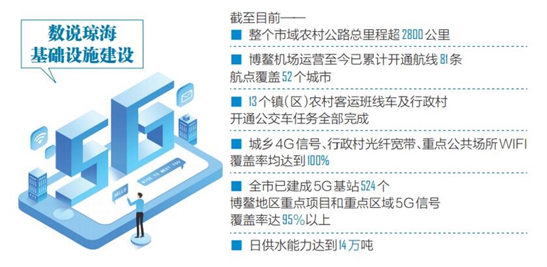 基礎(chǔ)設(shè)施的建設(shè)同樣離不開強有力的通訊保障。瓊海市科工信局副局長姚壇介紹,目前瓊海城鄉(xiāng)4G信號、行政村光纖寬帶、重點公共場所WIFI覆蓋率均達(dá)到100%。截至2020年11月底,全市已建成5G基站524個,博鰲地區(qū)重點項目和重點區(qū)域5G信號覆蓋率達(dá)95%以上。同時,博鰲東嶼島智能網(wǎng)聯(lián)汽車試運營、南海博物館5G創(chuàng)新應(yīng)用、博鰲樂城智能電網(wǎng)綜合示范區(qū)等5G應(yīng)用項目正在全力推進。