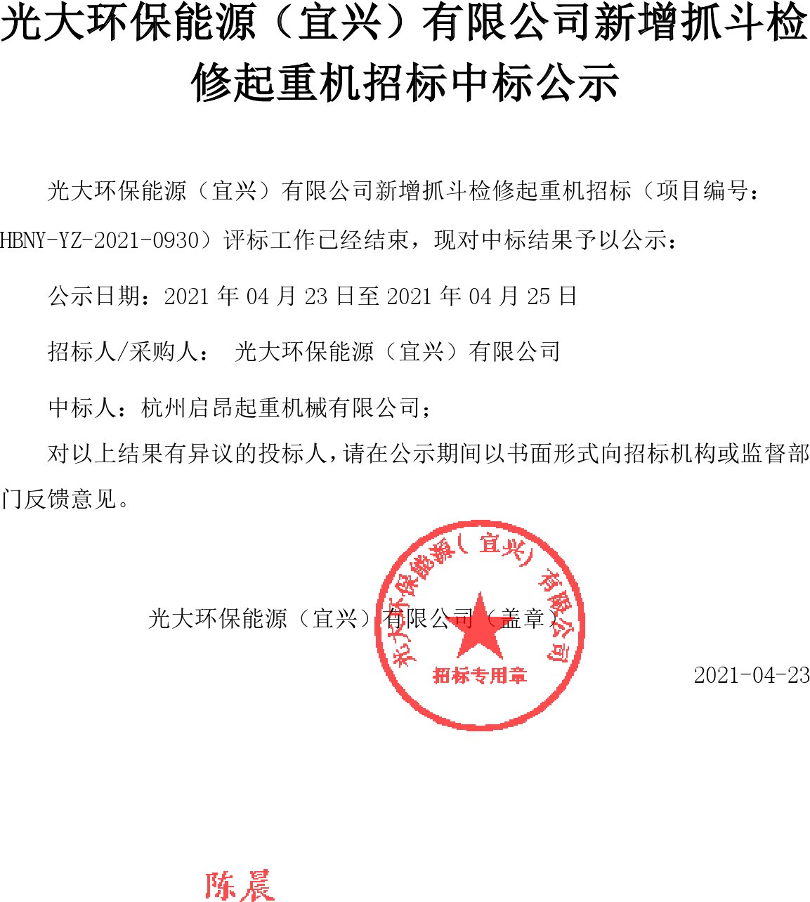移動版:江蘇:光大環(huán)保能源(宜興)有限公司新增抓斗檢修起重機招標中標結(jié)果公示