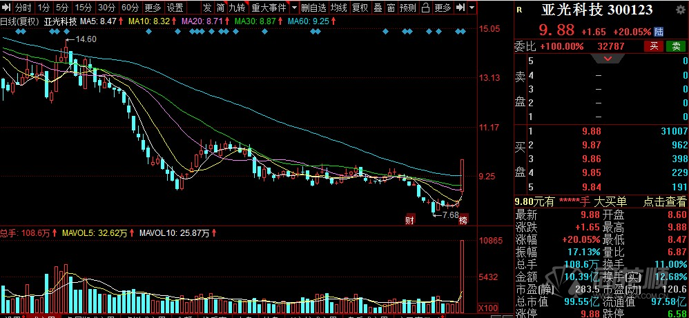 關(guān)注同花順財經(jīng)(ths518),獲取5月13日,亞光科技(300123)高開高走,并放出天量成功收獲20cm漲停,報9.88元/股,全天成交10.39億元,換手率11%。到底是什么原因使得股價低迷多日的亞光科技暴漲呢?或與昨日公告有關(guān)。