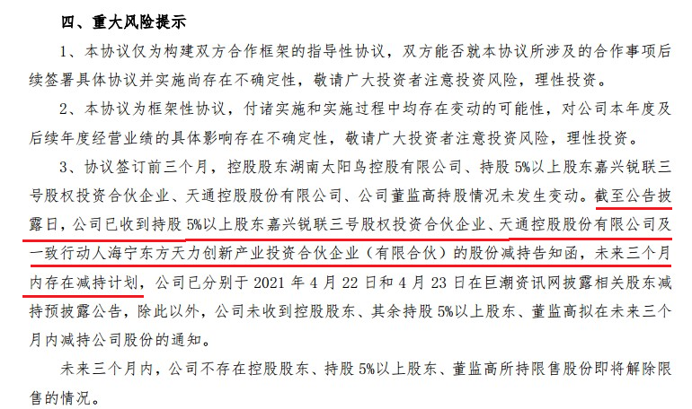 在此次公告中,風(fēng)險提示對公司業(yè)績的影響需視雙方后續(xù)具體合作協(xié)議的簽訂和實施情況而定。還提示了公司有三個大股東在未來三個月內(nèi)存在減持計劃。